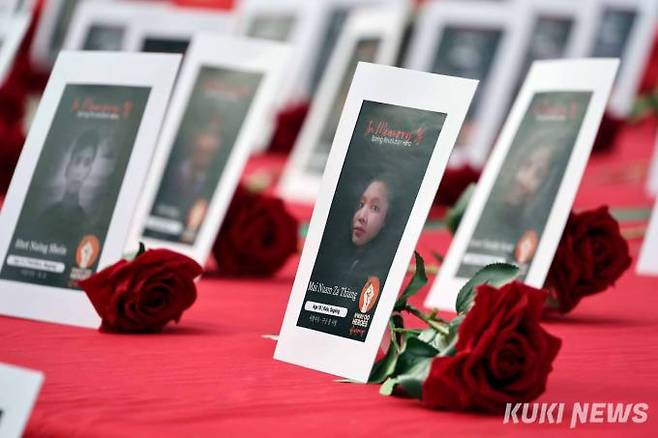 한국에서 미얀마 시민들을 응원하고 연대해 온 미얀마 민주주의를 지지하는 한국시민사회단체모임(106개 단체)이 1일 오전 서울역 계단에서 쿠데타 이후 사망한 미얀마 시민들의 영정 사진을 전시하며 연대를 호소하고 있다.
