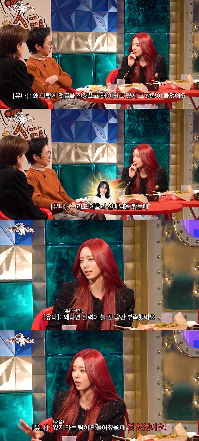 그런가 하면 유나는 처음부터 있지 멤버가 아니었다는 사실을 고백했다. 그는 "데뷔 전 연습생 때는 데뷔하려고 악착같이 했고, 데뷔 후에는 팀에 피해 안 주려고 악착같이 했다. 왜냐면 난 늘 약간 실력이 부족했다. JYP 연습생은 연습생 순위가 적혀 있는 통지서가 있는데 난 상위권이었던 적이 없다. 다른 있지 언니들은 늘 10위 안에는 들었다"고 말했다.