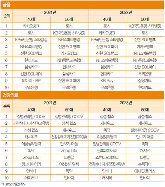 2021년 순위는 토스, KB국민은행, NH스마트뱅킹, 신한 SOL뱅크, 카카오뱅크 순이다. 2년이 지난 후 50대는 KB국민은행 앱을 가장 많이 썼고 이어 토스, 신한 SOL뱅크, 카카오뱅크, NH스마트뱅킹으로 순위가 바뀌었다. 6~10위권에서는 신한 SOL페이 앱이 9위에서 7위로, 우리은행 앱이 10위에서 8위로 약진한 반면 현대카드가 8위에서 10위로 떨어졌다는 점이 눈길을 끈다.