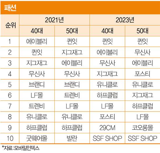 2021년만 해도 4050세대가 즐겨 쓰던 명품 앱 ‘트렌비’ ‘발란’ 등은 지난해에는 10위권 밖으로 밀려났다. 2030세대 기반으로 폭풍 성장했던 패션 앱 ‘브랜디’ 역시 2021년에는 4050세대 공략에 성공한 듯했으나 지난해에는 외면받았다. 반면 서비스 시작 때부터 4050 여성 패션 플랫폼을 표방한 ‘퀸잇’은 2021년에 이어 지난해에도 1위 혹은 선두권을 차지하면서 건재를 과시했다. 더불어 카카오스타일에서 4050세대를 겨냥해 출범시킨 포스티가 지난해 40대 8위, 50대에서 인기 앱 4위에 올랐다는 점도 눈여겨볼 만하다.