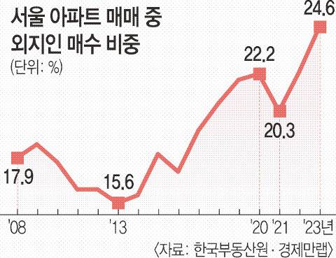 서울 아파트 거래 중 외지인 매수 비중은 2016년(17.2%)부터 4년 연속 늘다가 2021년 줄었지만 이듬해부터 다시 2년 연속 늘었다.