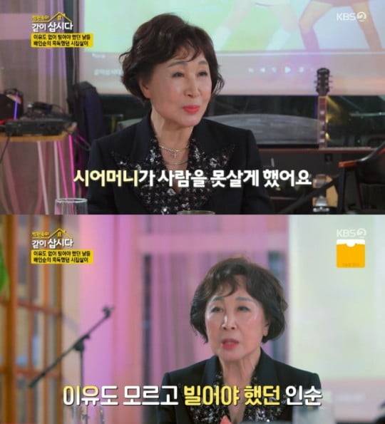 배인순은 결혼생활 당시 시집살이도 고백했다. 그는 "시어머니가 사람을 못 살게 했다"며 "쉬운 예로 까만 물건을 까맣다고 하면 하얗다고 했다. 아니라고 하면 야단을 맞아 죽을 죄를 지었다고 하면서 빌었다"고 해 충격을 안겼다.