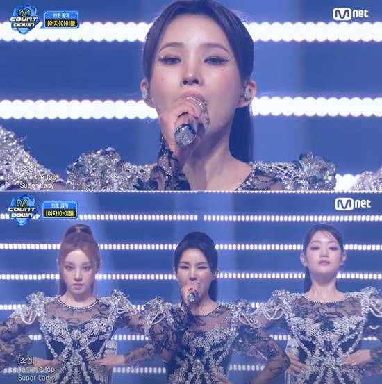 이날 역대급 스케일의 첫 컴백 무대에서 각 잡힌 대형으로 등장부터 압도적인 분위기를 자랑한 (여자)아이들. 도입부터 범접할 수 없는 하이피치 고음으로 "I am the top, super lady"를 외치는 소연의 남다른 아우라가 단연 시선을 끌었다.