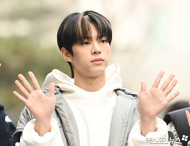 투어스 도훈이 출근길에 포즈를 취하고 있다.