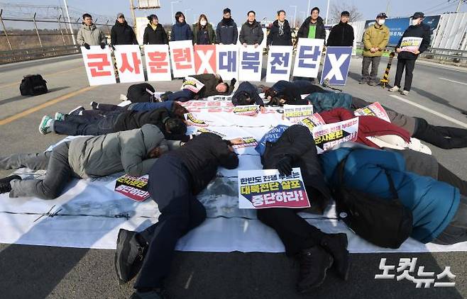 평화와 연대를 위한 접경지역 주민, 종교, 시민사회 연석회의 관계자들이 2일 오전 경기 파주 통일대교 앞에서 열린 ‘전쟁을 부르는 접경지역 군사훈련, 전단 살포 모두 중단하라’ 기자회견에 참석해 전쟁 위기를 경고하는 ‘다이-인 퍼포먼스’ 펼치고 있다.