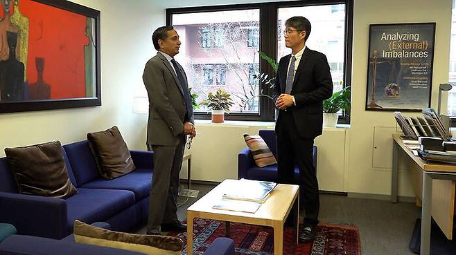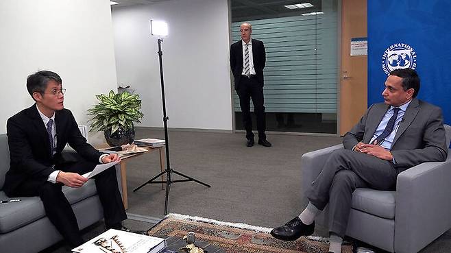 우리나라도 이런 흐름의 영향을 그대로 받았습니다. IMF는 한국의 올해 경제 성장률이 지난해 10월 전망치 보다 0.1%p 오른 2.3%에 이를 걸로 예측했습니다. 보고서에 나온 한국 관련 내용은 이게 전부입니다. 그렇다면 한국이 처한 현실은 어떨까요? 크리슈나 스리니바산 IMF 아시아태평양국장을 만나 보다 자세한 내용을 들어봤습니다. 먼저 한국 전망이 좋아진 이유를 물었습니다. 스리니바산 국장은 가장 큰 이유로 외부 수요가 살아났다는 점을 들었습니다. 개방형 경제로 수출 의존도가 큰 한국의 특성상, 미국과 중국 등 주요 시장이 예상보다 강한 회복세를 보인 게 유리하게 작용했다고 설명했습니다.