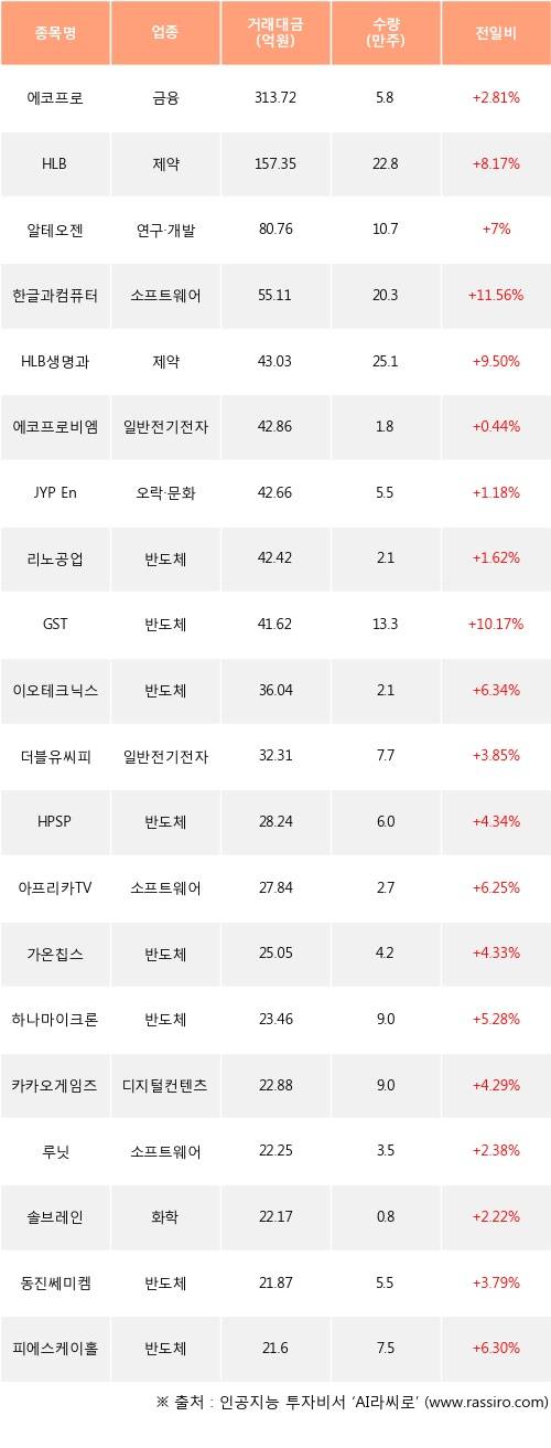 기관 투자자의 순매수 상위 20개 종목은 에코프로, HLB, 알테오젠, 한글과컴퓨터, HLB생명과학, 에코프로비엠, JYP Ent., 리노공업, GST, 이오테크닉스등이다.