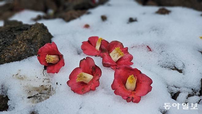 제주는 봄같이 따뜻한 겨울 날씨였다. 그러다가 폭설을 맞았으니 동백꽃이 얼고 상했다. 제주 자생나무인 구실잣밤나무가 기후위기로 고사하는 일이 생겨나는 가운데 이젠 동백도 안심할 수 없는 상황이다. 동백나무는 동박새가 꽃가루를 운반해 주는 조매화(鳥媒花)다. 날씨가 따뜻해져 동박새가 점점 북상하고 있다니 걱정이다.
