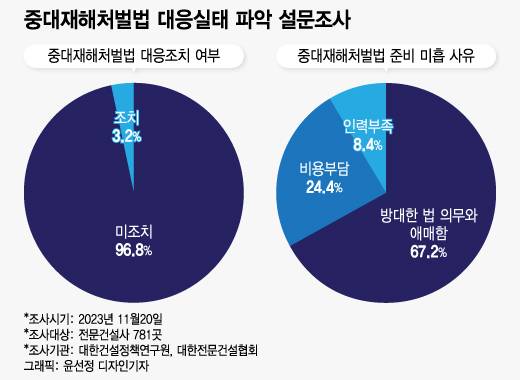 앞서 지난해 11월 대한건설정책연구원과 대한전문건설협회가 실시한 중대재해처벌법 대응실태 설문조사에서는 781곳의 전문건설사 중 대부분(96.8%)이 필요한 조치를 못 했다고 답했다. 협회 관계자는 "현장에서 안전은 투자의 개념으로 여긴다"며 "필수 투자지만, 당장 눈에 보이지 않기 때문에 영세한 곳들은 빠르게 대응하지 못할 수밖에 없다"고 말했다. 이어 "당장 제도 정비, 안전 대응보다 먹고 사는 것에 더 무게를 두는 소형 업체들은 제도 적응에 더 많은 시간이 필요한 게 사실"이라고 업계 분위기를 설명했다.