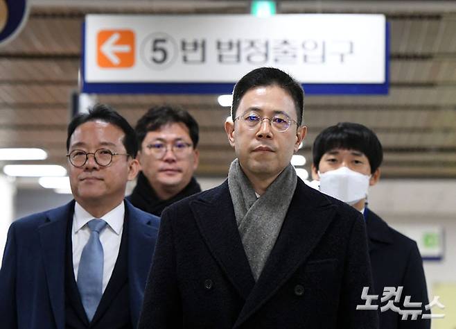 현직 검사가 미래통합당(현 국민의힘) 의원을 통해 더불어민주당 정치인들에 대한 형사고발을 종용했다는 이른바 '고발사주 의혹'으로 기소된 손준성 대구고검 차장검사(검사장)가 31일 오전 서울 서초구 중앙지법에서 열린 1심 선고공판에 출석하고 있다. 서울중앙지법 형사합의27부(재판장 김옥곤)는 31일 공직선거법·개인정보보호법·형사사법절차전자화촉진법 위반 및 공무상비밀누설 혐의로 재판을 받아온 손 검사장에게 징역 1년을 선고했다. 황진환 기자