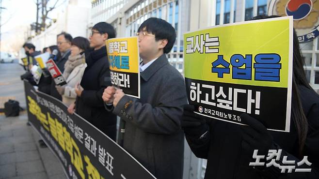 전국교직원노동조합이 30일 정부서울청사 앞에서 늘봄학교 계획 관련 현장교사 긴급 설문 결과 발표 기자회견을 하고 있다. 전교조는 교사 5877명을 대상으로 지난 25일부터 28일까지 진행한 '늘봄학교 계획 관련 긴급 설문' 결과를 30일 공개했다. 설문 결과에 따르면 응답 교사 97.1%가 교내 늘봄지원실 설치 계획에 반대했다. 늘봄지원실에 찬성하는 비율은 1.8%에 그쳤다. 박종민 기자