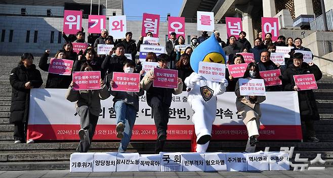 31일 서울 세종문화회관 계단에서 열린 2024 총선시민네트워크 출범 기자회견에서 참석자들이 퍼포먼스를 하고 있다. 90개의 시민단체·기구가 연대해 발족한 시민사회 연대체는 오는 4월10일 총선을 앞두고 공천 부적격 후보자에 대해 "공천 반대, 낙선 운동에 나선다"고 31일 밝혔다. 박종민 기자
