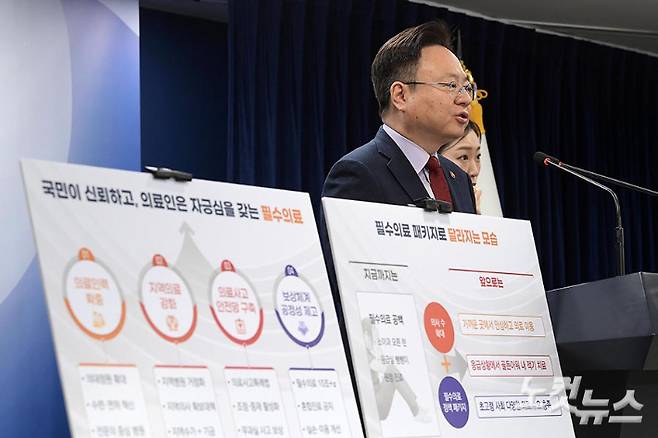 조규홍 보건복지부 장관이 1일 오후 서울 종로구 정부서울청사에서 국민과 함께하는 민생토론회 브리핑을 하며 필수의료 패키지에 대해 발표하고 있다. 정부는 이날 필수의료를 살리기 위한 해법으로, 의료인력 확충, 지역의료 강화, 의료사고 안전망 구축, 보상체계 공정성 제고 등 4대 개혁을 추진하겠다고 발표했다. 박종민 기자