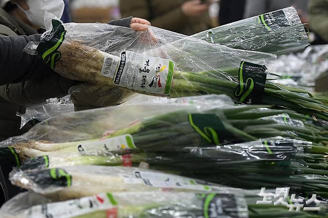 한국물가정보 조사에 따르면 올해 설 차례상을 차리는 비용이 또다시 역대 최고치를 갈아치웠다. 과일·채소류가 20% 넘게 오르며 장바구니 물가를 끌어올렸다. 전통시장 기준으로 대파는 1단에 4천 원으로 지난해 설보다 60%나 뛰었다. 사진은 31일 서울 한 대형마트의 대파 매대. 박종민 기자
