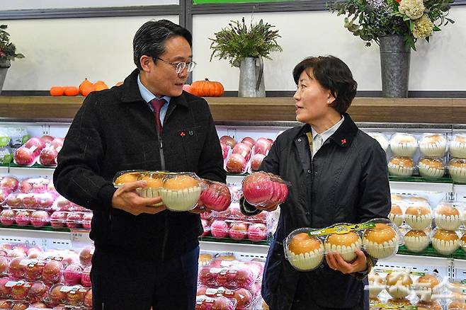 강도형(왼쪽) 해양수산부 장관과 송미령 농림축산식품부 장관이 31일 서울 하나로마트 양재점에서 설 성수품 수급상황을 점검하고 있다. 정부는 앞서 설 성수기 사과, 배, 소고기, 명태 등 성수품 16개 품목을 평상시의 1.5배 수준으로 확대 공급하겠다고 밝힌 바 있다. 박종민 기자