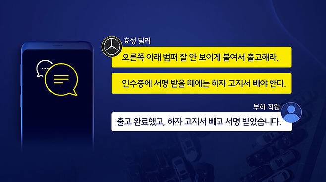 그런데 약 5년이 지나 다시 드러난 하자 차 판매에 대해서는 효성이 태도를 바꿨습니다. 효성 측은 취재진에게 "회사가 관여한 바 없고, 딜러들 개인의 일탈이다"라는 입장을 밝혔습니다. '공식 딜러사'라는 이름을 걸고 차를 팔았지만, 판매 과정에서 생긴 불법 행위에는 책임이 없다는 겁니다.