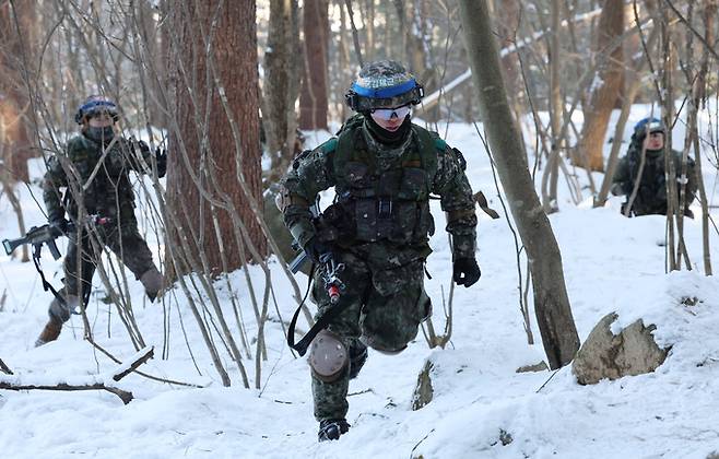 지난달 24일 강원도 인제의 눈이 쌓인 험준한 능선에 어두운 실루엣들이 아른거렸다. 전문대항군연대의 공방 훈련이 시작된 순간이다. 공격을 맡은 황군은 산악지형을 통해 시가지에 침투했고 청군은 방어를 맡았다. 기지 동쪽이 소란스러워지자 건물에 대기 중이던 청군은 일제히 소리가 나는 방향으로 총구를 돌려 방아쇠를 당겼다. 산발적인 총격전이 이어지던 순간 황군 2개 소대가 방어병력이 적은 서쪽 통문을 통과해 기지 안으로 침투했다.