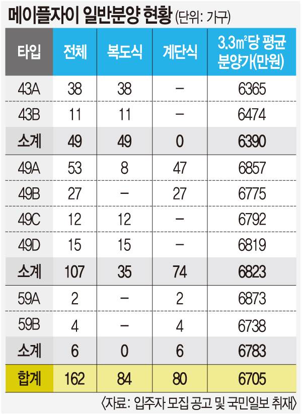 메이플자이는 일반분양 물량이 5% 미만으로 적은 데다 그중 66.0%를 차지하는 107가구가 49㎡에 몰려 있다. 수익성을 높이려면 이 평형 가격대를 되도록 높게 잡아야 한다. 완판 시 분양 수입으로 따지면 전체 2283억8700만원 중 약 70%인 1594억4100만원이 49㎡에서 나온다. 43㎡가 25.6%(585억3000만원), 59㎡는 4.7%(104억1600만원)에 불과하다.
