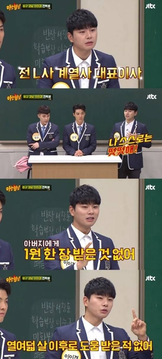 이이경은 지난 2020년 JTBC 예능 '아는 형님'에 출연해 대기업 임원 출신인 아버지의 존재를 언급하며 "전 L사 계열사 대표이사셨다. 학교를 자퇴한 뒤 아버지에게 손을 벌린 적이 없다. 18살 이후로 내가 벌어서 썼다"고 고백한 바 있다.
