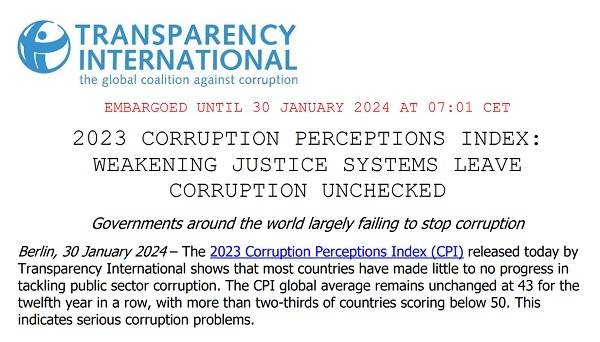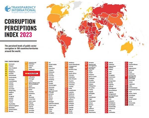 독일에 본부를 두고 있는 반부패운동단체 국제투명성기구(Transparency International·TI)는 30일 '2023년 국가별 부패인식지수(Corruption Perceptions Index·이하 CPI)'를 발표했다.