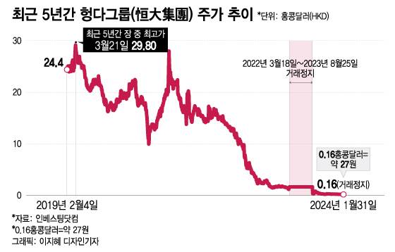 지난 2일 기준으로 홍콩 증시에서 헝다그룹(HK:3333)의 주가는 0.163홍콩달러(약 27원)를 나타내고 있다. 헝다그룹은 청산 명령을 받은 지난 29일 거래가 정지된 상태다. 마지막 거래일에는 전일 대비 20.87% 내리면서 명실상부 휴지 조각이 됐다. 현 주가는 최근 5년간의 고점(29.8홍콩달러) 대비 99.45% 내렸다.
