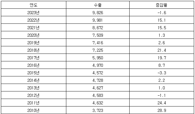 그렇지만 작년 수출 감소로 100억달러 관문을 넘지 못하고 상승세가 꺾인 모습이다.