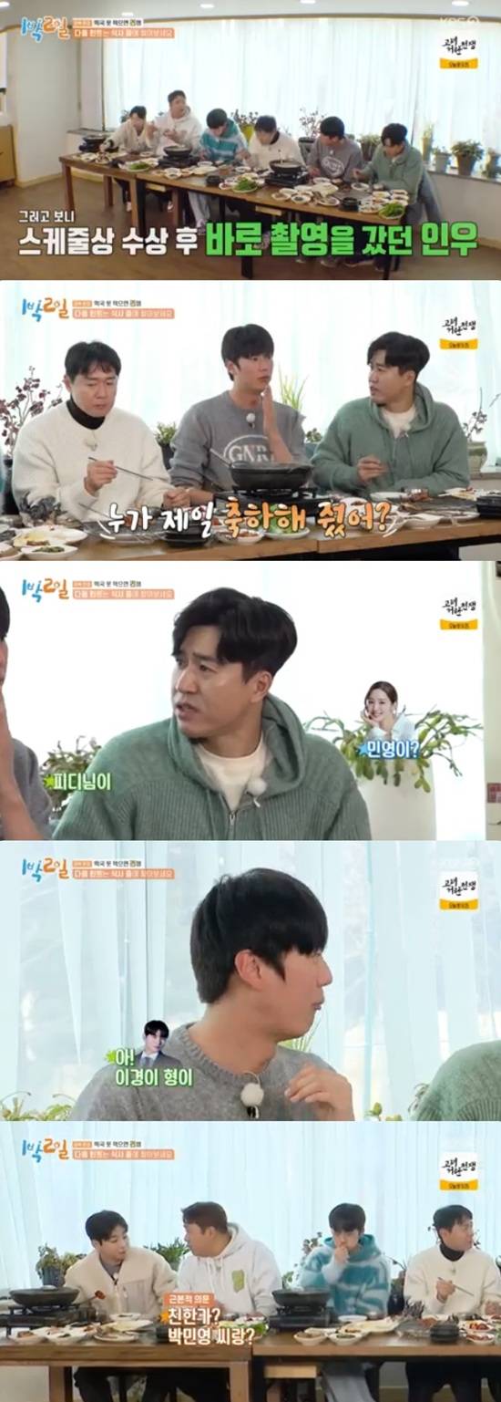 김종민은 "민영이?"라고 물어봤다. 나인우는 처음에는 PD님이라고 했다가 나중에 이이경이 가장 먼저 축하를 해줬다고 말했다.