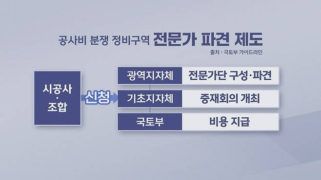 먼저 광역자치단체에서 정비 사업, 건설·토목, 법률, 회계, 행정 등 분야별 전문가 자문단을 꾸려놓고, 갈등을 겪는 시공사나 조합이 조정을 신청하면 기초자치단체가 광역시로부터 전문가들을 파견받아 회의를 열어 중재안을 도출하는 겁니다.