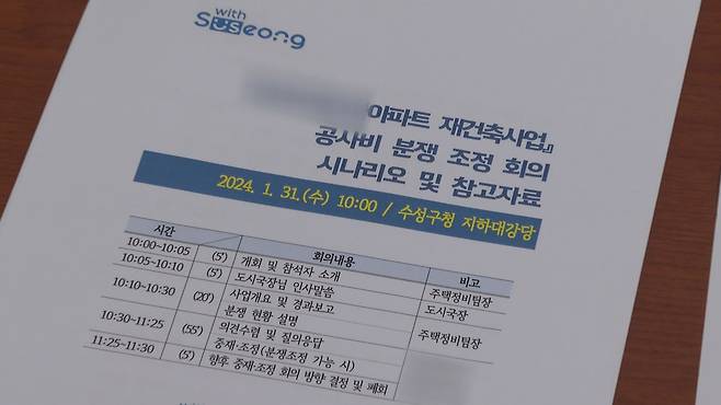 이조형 대구 수성구 건축과장 "이번 사안은 조합하고 시공사 사이에 공사비 증액 문제로 장기간 협의를 했지만, 의견 차이가 좀 컸습니다. 갈등이 장기화하면서 조합원과 일반 분양자들까지 피해가 클 수밖에 없거든요. 그런 점에서 중재회의라는 새로운 제도를 개최하게 됐습니다. 그전에는 구청 차원에서는 상호 간에 원만히 협의하라는 정도의 행정지도밖에 안 됐지만 이번 회의는 그래도 전문가들이 참여하고 공식적인 회의 절차를 거치기 때문에 어느 정도 협의·조정이 되지 않겠나 생각하고 있습니다."