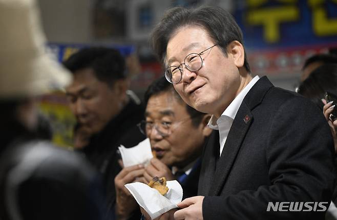 [광주=뉴시스] 박기웅 기자 = 이재명 더불어민주당 대표가 5일 오후 광주 서구 양동시장을 방문해 도너츠를 맛보고 있다. 2024.02.05. pboxer@newsis.com
