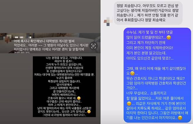이어서 한 누리꾼과 나눈 메시지를 첨부했다. 해당 영상에서 누리꾼은 "어그로 끈 점 죄송합니다. 저는 간호사도 아니고 일반 학생입니다. 게시판에 올라왔다고 분위기 흐린 점 죄송합니다"라고 사과했다.
