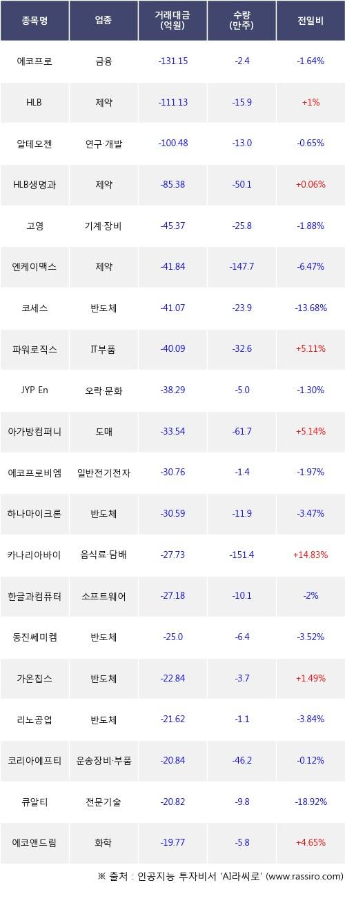 외국인 투자자의 순매도 상위 20개 종목은 에코프로, HLB, 알테오젠, HLB생명과학, 고영, 엔케이맥스, 코세스, 파워로직스, JYP Ent., 아가방컴퍼니등이다.