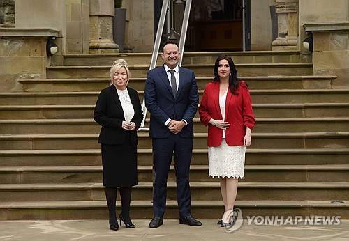 epa11128690 (L-R) First Minister for Northern Ireland Michelle O'Neill of Sinn Fein, Irish Taoiseach Leo Varadkar and Deputy First Minister Emma Little-Pengelly of the Democratic Unionist Party (DUP) pose for a picture at Stormont, Belfast, Northern Ireland, Britain, 05 February 2024. The British prime minister and Irish taoiseach are in Belfast to mark the return of devolved government in Northern Ireland. The Stormont Assembly was restored on 03 February 2024 after a two year hiatus caused by the Democratic Unionist Party (DUP) who paused business at the Assembly in protest at post-Brexit trading arrangements. EPA/MARK MARLOW