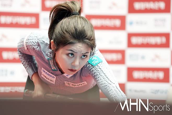 (MHN스포츠 고양, 박태성 기자) 김가영이 5일 경기도 고양시 킨텍스 PBA스타티움에서 열린 시즌 8번째 투어 '웰컴저축은행 웰뱅 PBA-LPBA 챔피언십' 64강전에서 최보람이 1번 테이블에서 경기를 펼치고 있다.