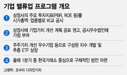 기업 밸류업 프로그램은 상장사의 주요 투자지표(PBR, ROE·자기자본수익률 등)를 시가총액·업종별로 비교 공시하고, 저PBR 상장사가 기업지배구조보고서에 기업가치 제고 계획을 기재하도록 권고한다. 공시우수법인은 가점을 주고, 주주가치가 높은 기업들로 구성된 지수 개발과 추종 상장지수펀드(ETF) 상장도 추진한다. 사실상 저PBR 기업의 주가부양 노력을 강제하고, 이를 독려할 수 있는 유인책을 마련하는 내용이다.
