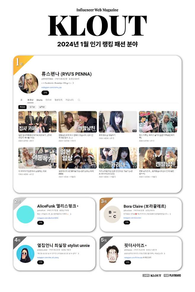 한편 류스펜나에 이어 2위에는 인스턴트펑크 대표이자 패션 스타일리스트인 김지혜 디렉터가 운영하는 '앨리스펑크(AliceFunk)', 3위는 패션 디자이너 '보라끌레르(Bora Claire)', 4위는 스타일리스트 최승희 실장이 운영하는 '옆집언니 최실장(stylist unnie)'이 차지했다. 마지막으로 20~30대 남자패션을 다루는 '핏더사이즈'가 5위에 랭크됐다.