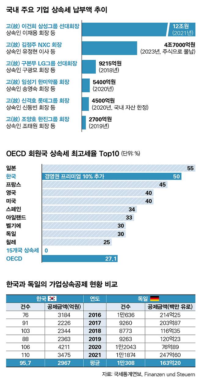 한국의 상속세 최고세율은 50%로 경제협력개발기구(OECD) 회원국 중 일본(55%)에 이은 2위다. 하지만 일정 규모 이상 기업에 적용되는 최대주주 할증(10%)까지 더해지면 60%로 사실상 1위다. 상속세 때문에 경영권 승계는 물론 기업의 존립 자체가 흔들릴 수 있다는 재계의 주장을 마냥 엄살로 치부할 수만은 없는 이유다.