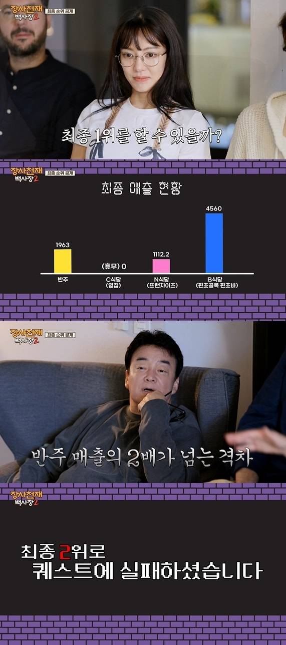 최종 1위를 기록하지 못한 채 2위로 막을 내렸다. 이우형 PD는 "백쌤이 1등을 너무 하고 싶어 했다. 1등 한 번만 하고 가자는 게 목표였다. 널널하게 한다는 기조였는데 계속 안되다가 막판에 나름 해보자고 밀어붙였다"라며 "(상대 가게의 결과가) 말도 안 되게 나왔다"며 "사실 쉽지 않지 않냐. 장사 2~3주 머물면서 그렇게 하기가 쉽지 않은데 잘 한 것 같아서 만족스러운 결과였다"고 전했다.
