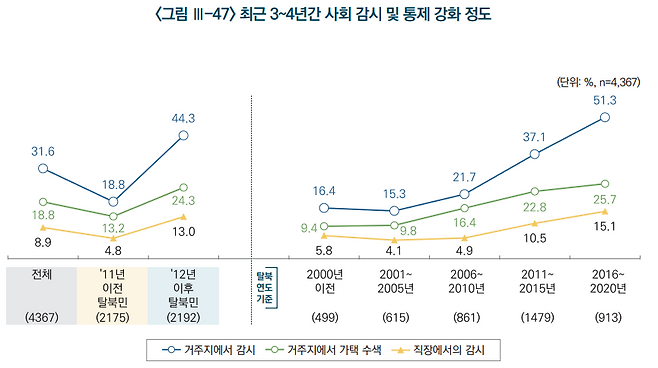 북한 정권은 주민 통제를 강화하고 있다. 응답자 중 51.3%는 거주지에서 감시·가택 수색을 경험했다. 월 수입의 30% 이상을 뇌물과 세외 부담 등으로 수탈당했다는 응답도 41.4%에 달했다. 교육에 있어서도 가장 중요한 과목은 김일성과 김정일의 우상화 교육이었다. 보고서는 "김정은의 '인민이 다시는 허리띠를 조이지 않게 하겠다'는 취임 일성이 무색하게 민생 개선 없이 주민을 조이고 있다"고 평가했다.