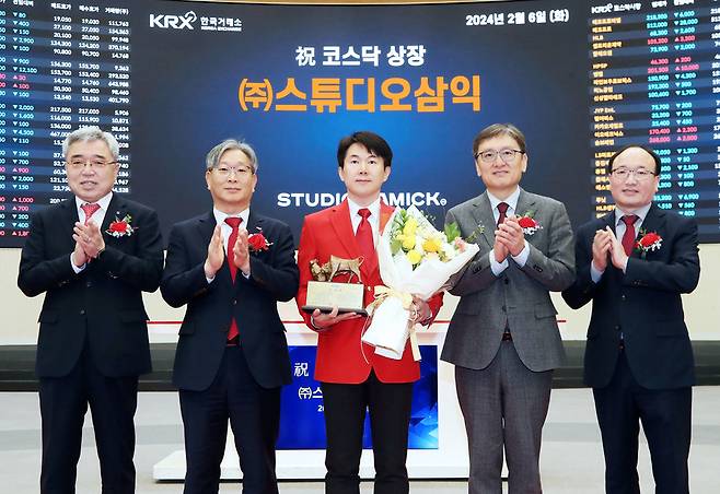 [스튜디오삼익 코스닥 상장기념식 (왼쪽부터 채남기 한국IR협의회 회장, 홍순욱 한국거래소 코스닥시장본부장, 최정석 (주)스튜디오삼익 대표이사, 곽봉석 DB금융투자 대표이사, 강왕락 코스닥협회 부회장 순). (사진=한국거래소 제공)]