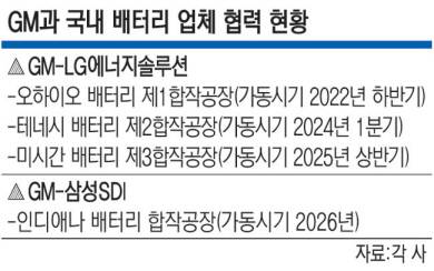 전동화 전환 과정에서 GM과 국내 배터리 업체들은 이미 끈끈한 협력 관계를 강화하고 있다. GM은 LG에너지솔루션과 미국 오하이오주, 테네시주, 미시간주에서 배터리 합작공장을 가동·건설 중이다. 오하이오 제1 공장은 2022년 하반기 가동을 시작해 연 40GWh 규모의 배터리를 생산하고 있다. 테네시 제2 공장(연산 50GWh)과 미시간 제3 공장(연산 50GWh)은 각각 올해 1분기와 내년 상반기에 가동을 시작할 예정이다. 삼성SDI와는 미국 인디애나주에서 2026년 가동을 목표로 배터리 합작공장(연산 30GWh)을 짓고 있다.