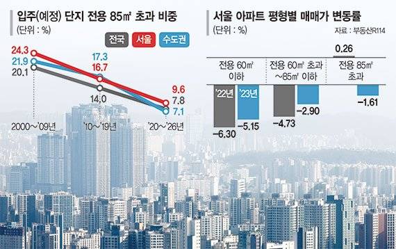 전용 85㎡ 초과 비중은 2000년~2009년에 24.3% 였으나 2020년~2026년은 9.6%로 뚝 떨어졌다.