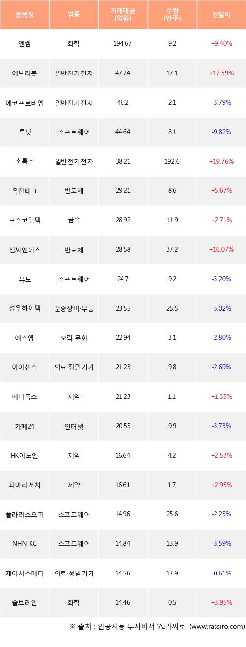 외국인 투자자의 순매수 상위 20개 종목은 엔켐, 에브리봇, 에코프로비엠, 루닛, 소룩스, 유진테크, 포스코엠텍, 샘씨엔에스, 뷰노, 성우하이텍등이다.