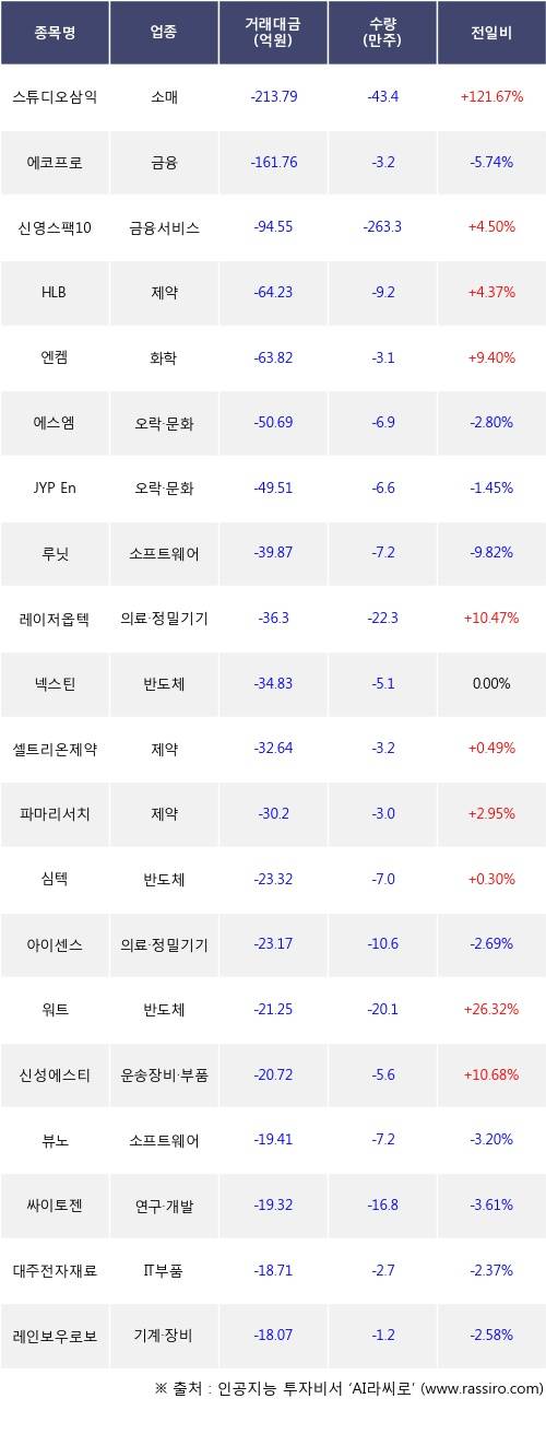 기관 투자자의 순매도 상위 20개 종목은 스튜디오삼익, 에코프로, 신영스팩10호, HLB, 엔켐, 에스엠, JYP Ent., 루닛, 레이저옵텍, 넥스틴등이다.