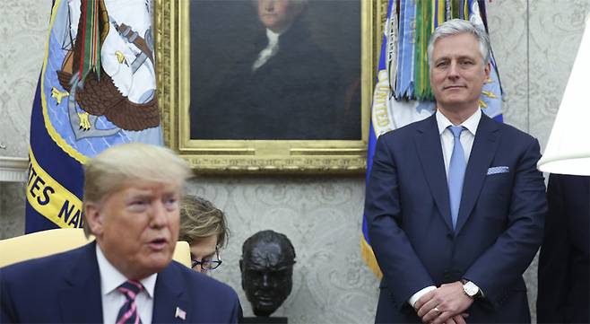 | 트럼프 집권 당시 백악관의 오브라이언 2019년 12월 미국 워싱턴 백악관 집무실에서 도널드 트럼프 당시 대통령(왼쪽)과 함께 있는 로버트 오브라이언 전 백악관 국가안보보좌관. 오브라이언 전 보좌관은 5일(현지 시간) 동아일보·채널A 인터뷰에서 “(주한)미군 병력과 자산은 중국을 더 억지하는 방식으로 분산될 수 있다”고 말했다. 워싱턴=게티이미지 |