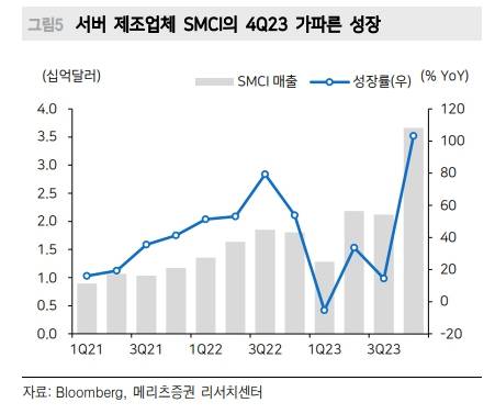 황 연구원은 "클라우드 서버 수요가 계속 늘고 있기 때문에 여기에 추가적인 설비 투자가 필요한데 이게 데이터센터 설비투자 매출로 이어진다"며 "서버 제조업체 중 AI 관련해 가장 성과가 두드러지는 대표적인 기업인 SMCI는 지난해 4분기에 전년 동기 대비 103%의 매출 성장률을 보고했다"고 분석했다.