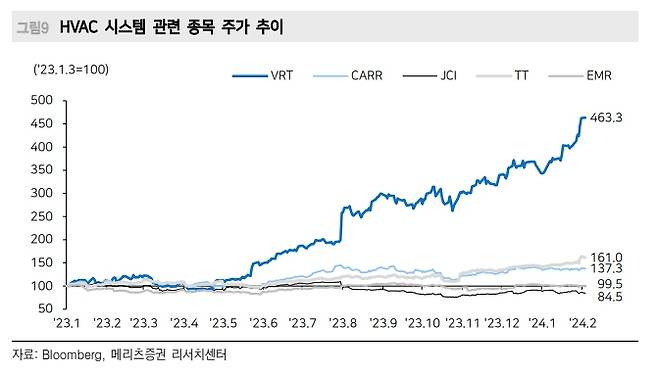 그는 "HVAC 관련 대표 기업은 버티브 홀딩스(VRT), 캐리어 글로벌(CARR), 존슨 컨트롤즈 인터내셔널(JCI), 트레인 테크놀로지스(TT), 에머슨 일렉트릭(EMR) 등이다"며 "이 중 AI 성장 모멘텀을 공유한 기업은 버티브 홀딩스다. 버티브 홀딩스는 2023년 초 이후 363%의 주가 수익률을 기록 중"이라고 밝혔다.