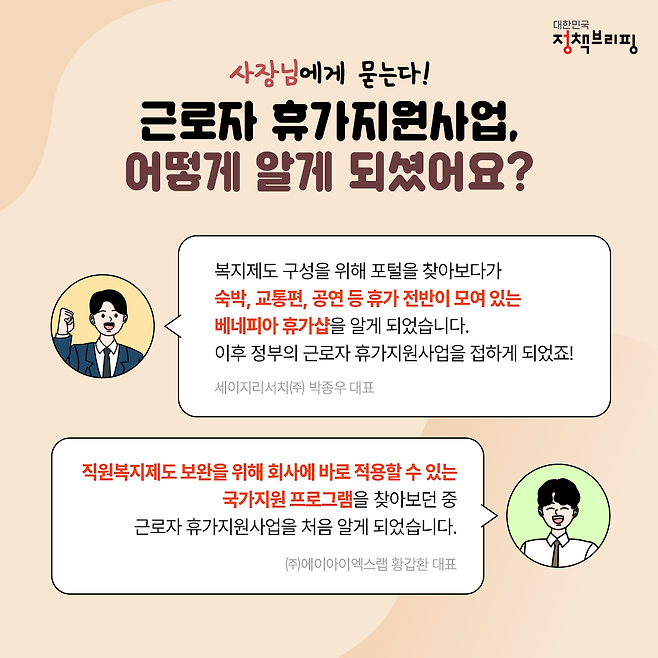 - 직원복지제도 보완을 위해 회사에 바로 적용할 수 있는 국가지원 프로그램을 찾아보던 중 근로자 휴가지원사업을 처음 알게 되었습니다.
