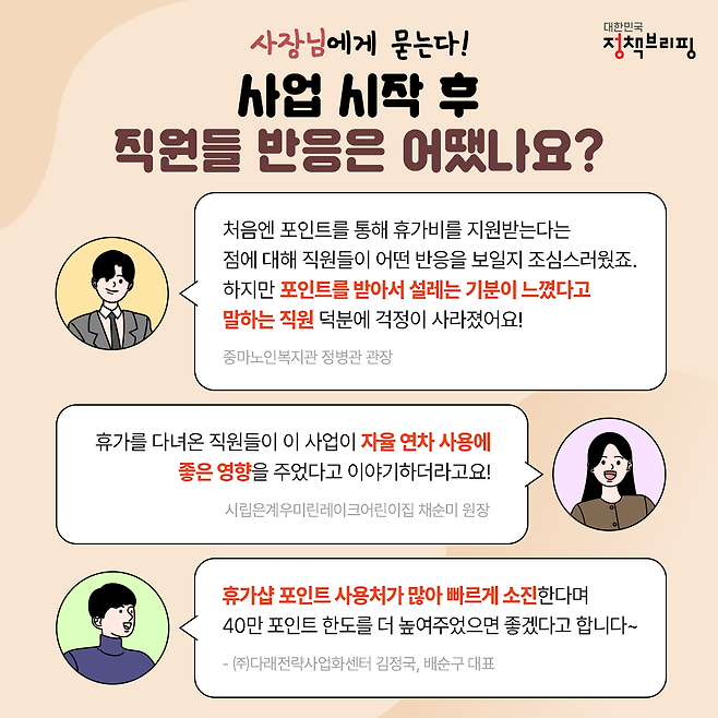 - 처음엔 포인트를 통해 휴가비를 지원받는다는 점에 대해 직원들이 어떤 반응을 보일지 조심스러웠죠. 하지만 포인트를 받아서 설레는 기분이 느꼈다고 말하는 직원 덕분에 걱정이 사라졌어요!