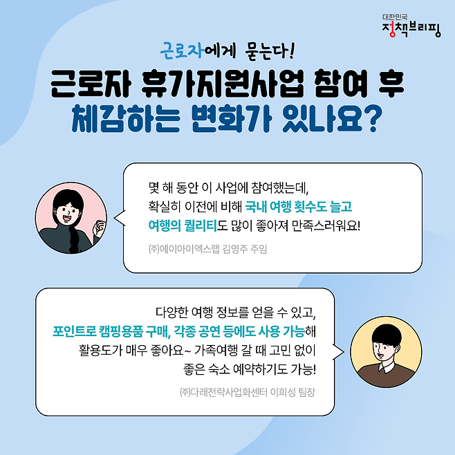 - 몇 해 동안 이 사업에 참여했는데, 확실히 이전에 비해 국내 여행 횟수도 늘고 여행의 퀄리티도 많이 좋아져 만족스러워요!